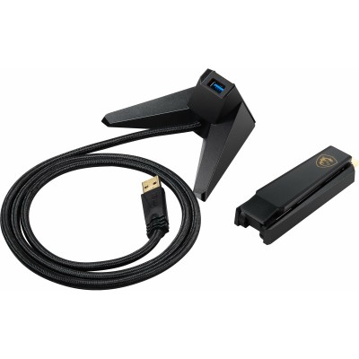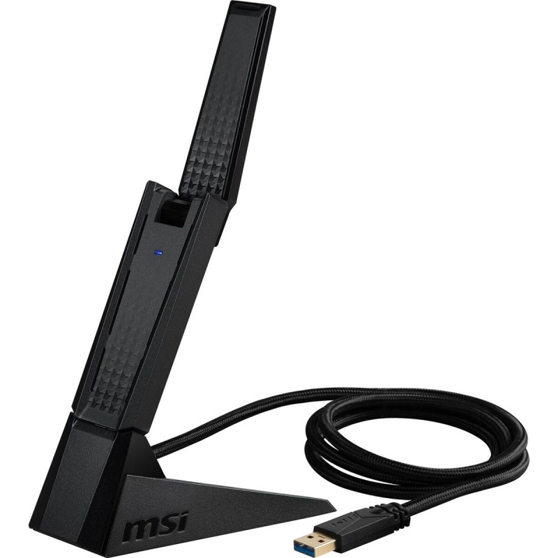 The MSI AXE5400 network adapter is a device designed to enhance your desktop or laptop’s wireless connectivity using advanced Wi-Fi 6E technology, which includes the innovative 6 GHz frequency band to achieve ultra-fast speeds and ensure reduced latency in high-demand network environments. This adapter provides a stable, wide-range connection thanks to its two adjustable high-gain tri-band antennas, optimized to form signal beams that improve coverage and transmission quality in complex spaces. Compatible with USB 2.0 and USB-A interfaces, it easily connects to any device via a standard USB port, offering usage flexibility and positioning with its USB base for simple, quick setup. The AXE5400 supports the WPA3 security protocol, which includes advanced encryption to protect your data and keep your wireless network safe from external threats. Its compact design in black integrates discreetly with any device, while its 5V power supply ensures energy efficiency during operation. This adapter is an ideal solution for users wanting to upgrade their devices to the latest wireless connectivity standards without relying on internal or complex solutions. Overall, the MSI AXE5400 combines cutting-edge technology and ease of use to deliver an enhanced and secure Wi-Fi experience in home or professional settings.