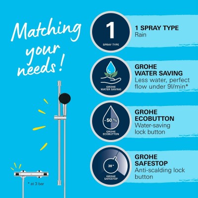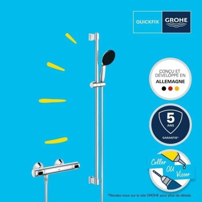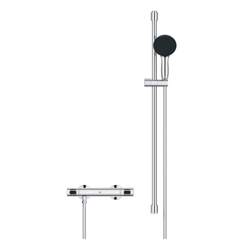 The Grohe thermostatic shower set offers a complete and functional bathroom solution, featuring a modern and efficient design. This system includes a shower column with a thermostatic mixer that maintains a constant and safe temperature throughout the shower, preventing sudden hot or cold changes. It has a carefully polished chrome finish that provides corrosion resistance and an elegant, shiny look, while also making cleaning and maintenance easier. Made of high-quality plastic combined with metal components, the set is designed for easy wall mounting, optimizing bathroom space without sacrificing comfort. Its thermostatic mechanism not only ensures safety but also energy savings by precisely regulating the temperature. The product’s functionality is complemented by a single water jet that delivers a uniform and pleasant flow, ideal for those seeking a practical and efficient shower experience. Its gray tone gives it a neutral and sober style that fits various decor styles. This set is a suitable choice for those who value quality, durability, and technical features in bathroom accessories, balancing contemporary design with functionality. With this model, Grohe reaffirms its commitment to innovation and reliability in shower solutions.