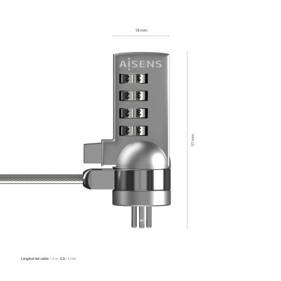 The ASLK-D40N01-SL by Aisens is a security cable designed to provide effective protection for devices such as computers, monitors, and laptops against theft in public and professional environments. Made from durable steel, this model offers a robust structure that is difficult to break, while its 1.5-meter length gives the flexibility needed to secure equipment to desks, tables, or fixed points with ease. It features a T-Lock combination lock that eliminates the need for keys and allows you to set a personal access code for added convenience and security, reducing the risk of loss. The round design with a 4.0 mm thickness optimizes both cut resistance and maneuverability in various workspaces. Its silver finish is not only discreet and professional but also elegantly matches any device and setting. The Aisens ASLK-D40N01-SL is the ideal solution for those seeking simple and effective protection for their electronic devices in offices, libraries, or shared spaces.