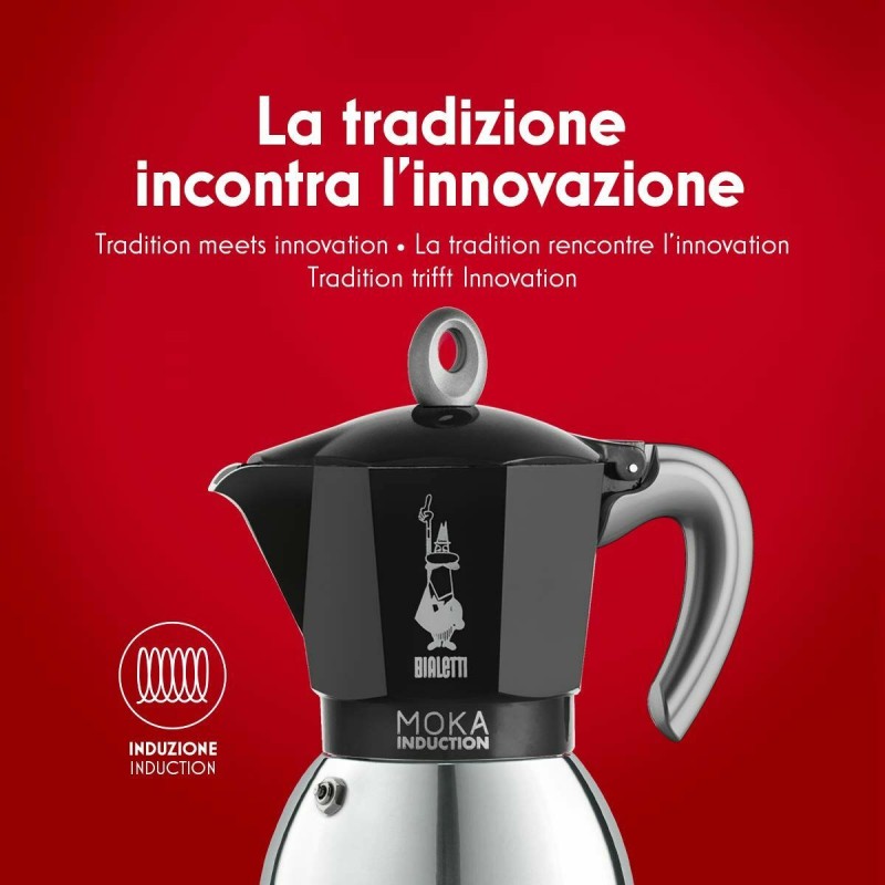 The Bialetti New Moka Induc Black 4-cup Italian coffee maker is a classic design adapted for convenience and functionality in home coffee brewing. Made of aluminium, this material ensures fast heat conduction and outstanding durability, allowing even heat distribution during extraction. Its black finish gives it a modern and elegant look that fits perfectly in any kitchen, while also providing resistance to stains and corrosion. This coffee maker is specially designed as a traditional Italian coffee maker that can be used on gas and induction cooktops, thanks to its design adapted for induction hobs, greatly increasing its versatility across modern kitchen types. With the capacity to brew up to 4 cups of coffee, it is ideal for enjoying an espresso with the characteristic intense flavour and aroma typical of this method, respecting the Italian coffee-making tradition. The Bialetti New Moka features a simple system for easy use and cleaning, making it suitable for both experienced users and those new to Italian-style coffee brewing at home. Its compact and functional design allows for convenient storage without taking up much space. Overall, this coffee maker offers a practical and reliable solution for those seeking to preserve the essence of classic espresso coffee with the quality and guarantee of a historic brand like Bialetti.