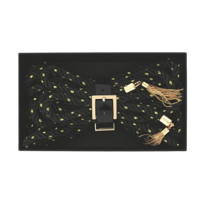Designed for those who appreciate both form and function, the Embrace Rope 7M glides easily against the skin while maintaining enough structure for secure knots and reliable tension. Whether wrapped gently around wrists or shaped into a striking torso harness, each bind enhances connection and anticipation. The shimmering gold accents and elegant tassel ends elevate the rope from a simple restraint to an experience in itself—adding glamour to every twist and tie.