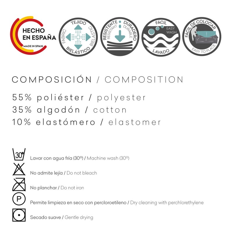 Type: Sofa Cover Colour: Light grey Suitable for: Dryer Material:35 % Cotton 10% Elastomer 55 % Polyester Washing instructions:Do not use bleach Dry cleaning Maximum wash temperature 30 ºC Not suitable for: Sheet Approx. dimensions: 120 x 120 x 360 cm Reference D1607218