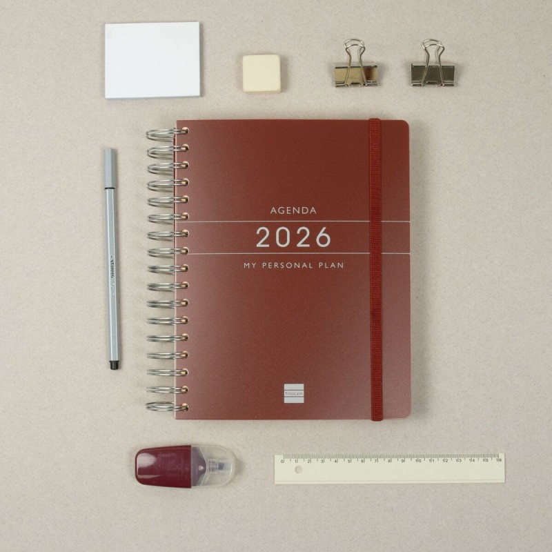 The Finocam Tempus planner is designed to enable efficient personal and work time management, offering clear daily organization adaptable to user needs. It features a hard polypropylene cover in burgundy that provides strength and durability, complemented by a practical double spiral binding for easy and comfortable handling. Its approximate dimensions of 15.5 x 21.7 cm (1/4 format) make it a manageable size, easy to carry. Inside, it contains 80 g/m² chlorine-free FSC-certified paper, ensuring good writing quality and a commitment to sustainability. The planner closes with an elastic band that protects the contents and prevents accidental opening, while two ribbon markers allow quick access to different sections of the year. Its layout is one day per page, with a full 12-month calendar (January-December), allowing detailed and organized tracking of appointments and goals. At the beginning, it includes an introductory section with a tutorial to maximize planner use, as well as informative content and extra blank pages to personalize usage according to user interests. This product is made in China and designed to meet the needs of users seeking a practical, durable, and well-structured tool for daily management. The Finocam Tempus planner combines functionality, quality, and a sober style to support comfortable and reliable annual planning.