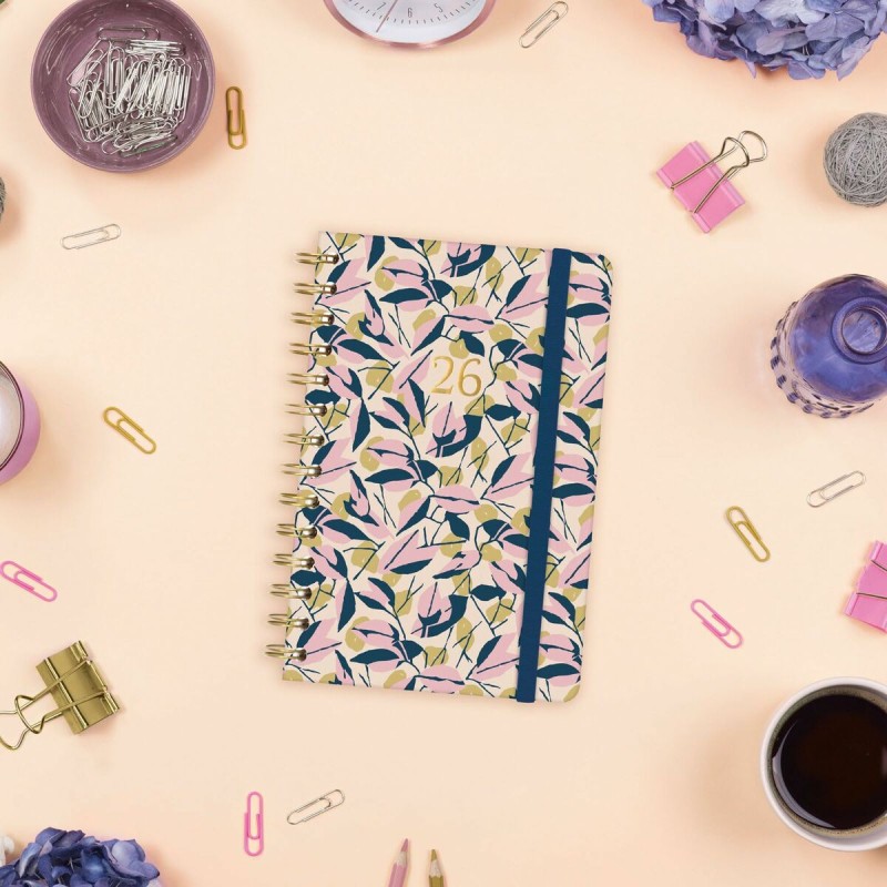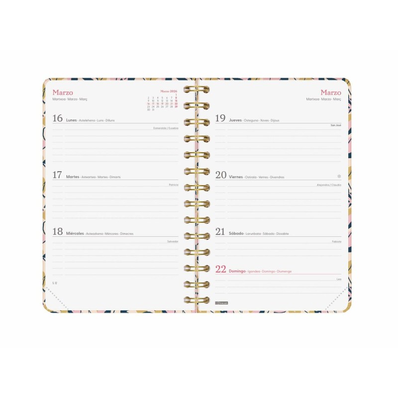 The YOU planner by Finocam is a product designed for efficient organization in both personal and professional settings, featuring a compact 11.7 x 18.1 cm size that makes it easy to carry and handle. It has a double spiral binding that allows full and comfortable opening for daily use, protected by a hard cover made of cardboard covered with a matte scratch-resistant laminate, providing durability and an elegant finish with metallic details that enhance the design. Made entirely of 80 g/m² chlorine-free paper with FSC certification, it is designed to offer smooth writing and durability, combining quality with environmental responsibility. Its internal layout is a horizontal week-at-a-glance format, including a full annual calendar of 12 months (January to December) for 2026, featuring useful information such as national holidays, name days, seasonal changes, and references to other cultural calendars, facilitating broad and contextualized planning. The planner includes a practical elastic closure band that secures the contents and prevents accidental openings, plus micro-perforated corners to quickly locate the current day or week, optimizing navigation through daily content. Inside, it stands out for a clean and organized design, with enough space to note projects, tasks, and commitments, adapting to various organizational needs without overcrowding the page. As a functional addition, it includes a set of themed stickers that support personalization and quick visual management of events or priorities. Produced in China, this product meets all these quality standards, offering a versatile, practical planner with refined finishes ideal for those seeking to combine style and functionality in one product. In short, the Finocam YOU planner is a complete and well-structured solution for daily time management with a modern and durable design.