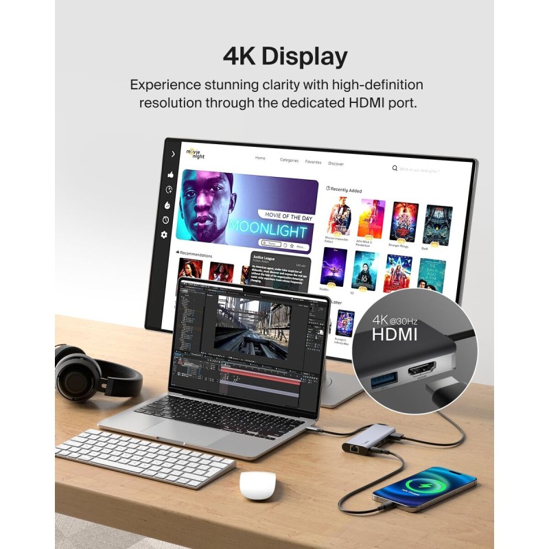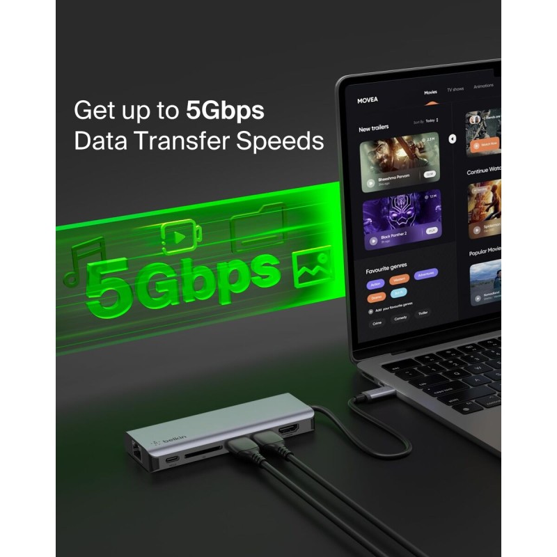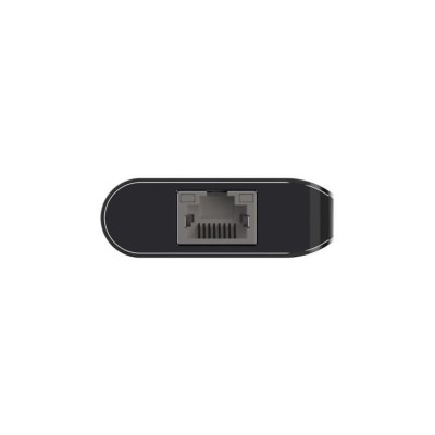The Belkin AVC008BTSGY USB hub is a compact and versatile device designed to expand the connectivity options of laptops and USB-C compatible devices. This multifunction USB hub combines docking station features with a wide range of ports, including HDMI, USB 3.2 Gen 1 Type-A and Type-C, and SD card slots, enabling simultaneous connection of external monitors, peripherals, and storage devices. Its USB 3.2 Gen 1 host interface (equivalent to 3.1 Gen 1) ensures high transfer speeds, while its support for USB Power Delivery allows charging devices with up to 100 W power, providing fast and efficient charging without sacrificing connectivity. Featuring a black and silver design, this hub has compact dimensions (117 mm wide, 47 mm high, and 16 mm deep), making it easy to carry and use in professional or personal settings. It also includes an RJ-45 port for Ethernet connection, expanding network options with a stable and fast wired connection. This product is ideal for users needing to centralize and manage multiple connections in one compact and reliable device. The integration of modern ports and powerful charging support makes the Belkin AVC008BTSGY a practical solution to optimize workspace and boost productivity.