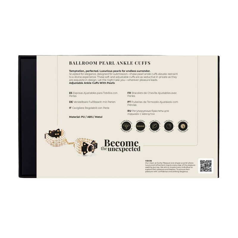 The Ballroom Pearl Ankle Cuffs combine elegant styling with functional restraint, offering a high-end accessory that blends fashion, fantasy, and comfort. Crafted with soft vegan leather, radiant faux pearl strands, and finished with gold-toned hardware, these cuffs are designed to captivate both visually and sensually.