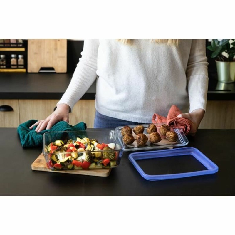 The Pyrex lunchbox set consists of three rectangular containers made of borosilicate glass, a material known for its high thermal resistance and durability, allowing safe use in microwaves, conventional ovens, and dishwashers without risk of deformation or contamination. Each container has a capacity of 800 ml, ideal for individual portions or for storing leftovers in an organized and efficient way. This set features transparent lids with a hermetic seal that ensure food preservation, preventing spills and keeping freshness longer. It also has a design in blue and transparent tones, making it easy to identify contents without opening. The complete absence of plastic in the product offers a healthier and more sustainable alternative for food storage and transport, especially for users who prefer utensils free of harmful materials or flavor alteration. Its rectangular shape allows optimal space use in both the fridge and pantry, providing a practical and modern solution for daily use. Overall, this Pyrex lunchbox set combines functionality, high-quality materials, and a design that easily adapts to various home storage needs.