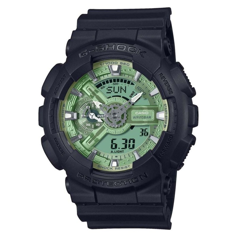 The Casio G-Shock GS is a men’s watch designed for those seeking durability and functionality in a versatile, long-lasting accessory. This model stands out with its combination of black and green colors, offering a modern, sporty style while ensuring easy readability. Its resin strap guarantees lightness and toughness, providing a comfortable fit and high resistance to daily wear. Equipped with multifunction features, it offers advanced capabilities that support various daily and sports activities, such as a stopwatch, alarm, calendar, and other typical G-Shock utilities that deliver robustness and precise time control. Additionally, it includes a buckle-type clasp that ensures security and ease when putting on or removing the watch. The solid construction and high-quality materials make this watch a reliable choice for everyday use, adapting to an active and demanding lifestyle. The Casio G-Shock GS combines functionality and design to offer a durable and practical accessory made for the contemporary man.