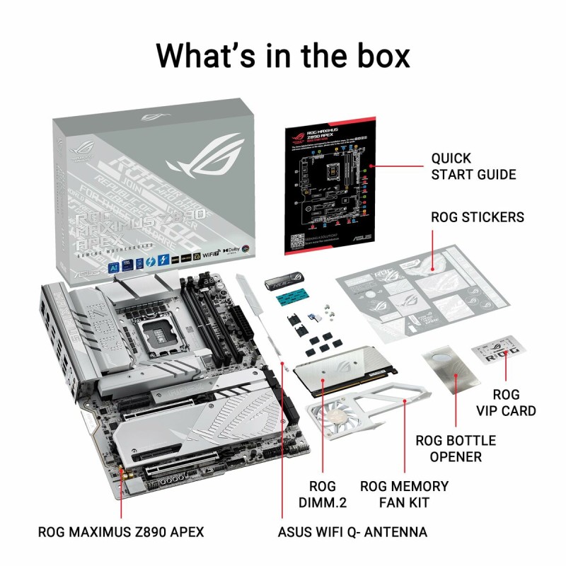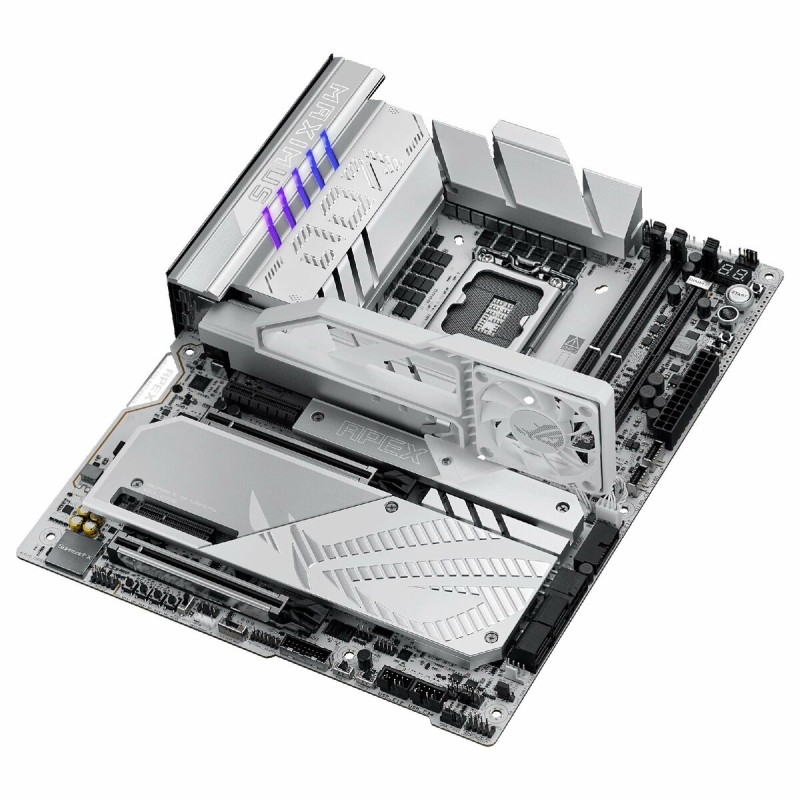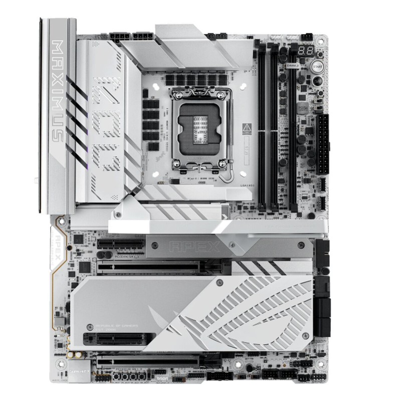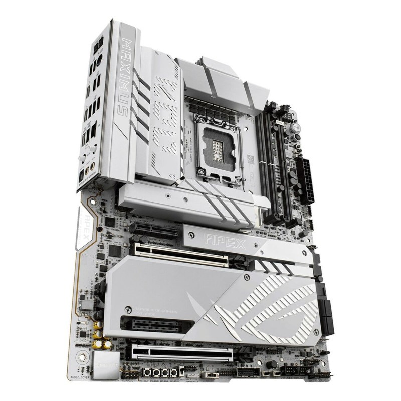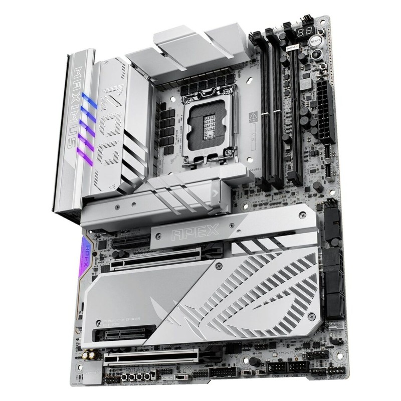 The Asus MAXIMUS Z890 APEX Motherboard is an advanced component designed for enthusiasts and professionals seeking maximum performance in their systems. This ATX motherboard features the powerful Intel Z890 chipset, supporting the latest generations of Intel processors with LGA 1851 socket, ensuring compatibility with high-performance CPUs and advanced technologies. Its architecture is optimized to handle DDR5 SDRAM memory, allowing higher speeds and greater efficiency, ideal for intensive workloads such as gaming, multimedia editing, or demanding professional applications. The board offers full connectivity with USB and USB-C ports, facilitating connection of modern devices and next-gen peripherals. It also supports Bluetooth, expanding wireless options for compatible accessories. For graphics, it provides an HDMI output for high-definition video transmission, compatible with both monitors and TVs, contributing to a clear and detailed visual experience. Its networking capability stands out with a 5 GbE LAN port that delivers high-speed, low-latency Ethernet connection, essential for heavy data transfers and online gaming. Compatible with Windows 11 operating systems, this motherboard is ready to leverage the latest system improvements and optimizations, ensuring long-term stability and compatibility. Its white design adds a modern and distinctive aesthetic touch for users who value internal appearance alongside technical functionality. Overall, the ASUS MAXIMUS Z890 APEX represents a robust and versatile solution for users needing a reliable and powerful foundation for building or upgrading a high-end PC.