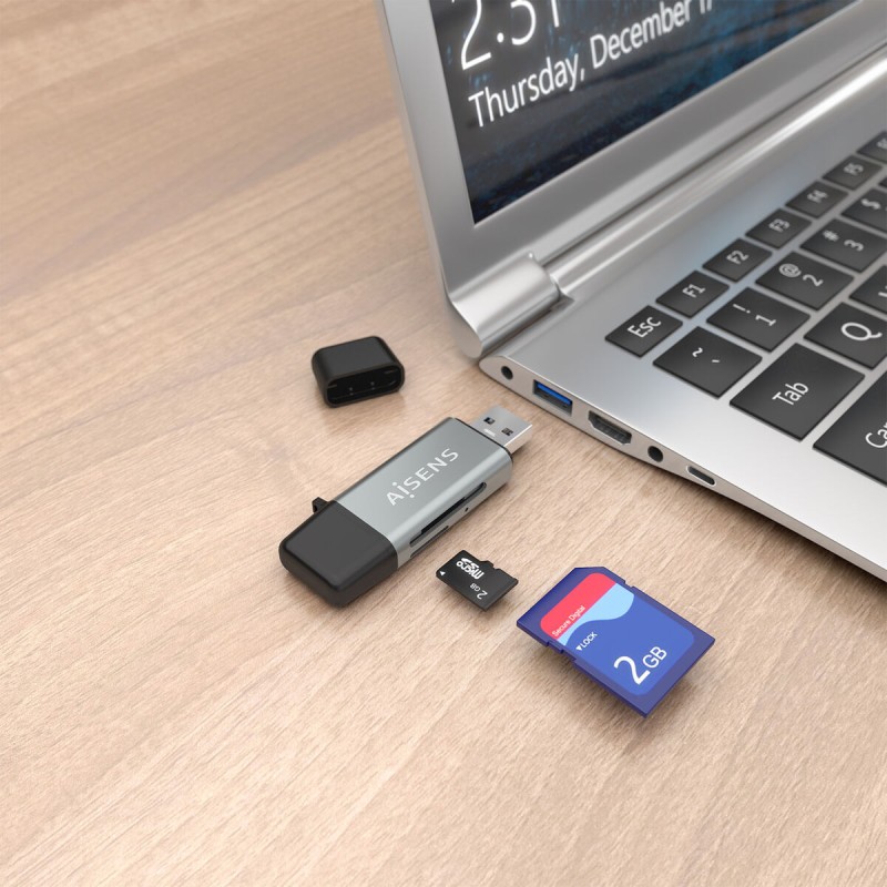 The ASCR-2AC11-GR card reader from Aisens is a versatile device designed to facilitate data transfer and management from multiple memory card types, with connection via USB-C or USB-A. Its compact and sturdy design, made of gray plastic, measures approximately 22 mm in length, making it a practical accessory to carry and connect anytime. This reader supports USB 3.1 Gen1 (USB 3.0) technology, ensuring fast transfer rates and compatibility with a wide range of operating systems such as Windows 7, 8, 10, and 11, as well as Mac OS 10.12 or higher and OS X 10.10, guaranteeing flexible use in both PC and Mac environments. It allows simultaneous reading and writing on two cards, including common formats essential for photography and mobile phones like SD, Micro SD, MMC, RS-MMC, MMC Micro, and SIM cards, enhancing its practical functionality for users handling various devices and storage formats. Additionally, this device operates in plug & play mode, freeing users from complicated driver installation and enabling immediate use upon connection. It complies with European quality and safety standards RoHS and CE, ensuring a reliable and environmentally friendly product. Overall, this Aisens card reader offers an efficient solution compatible with a broad spectrum of cards and computers, combining speed, convenience, and practicality in a discreet and durable design. It is an essential tool for professionals and regular users who require quick and secure access to different types of external memory.