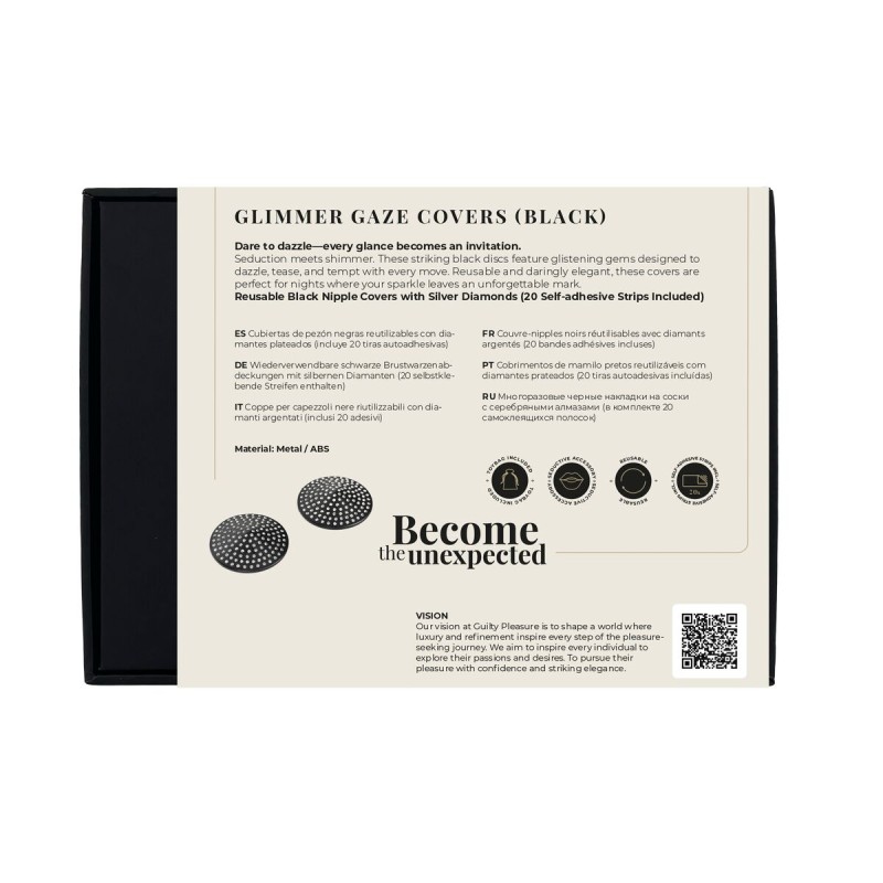 Every jewel tells a story — yours begins with a shadowed glimmer. The black Glimmer Gaze Covers redefine subtle seduction with their sleek, black metal base and sparkling black crystal accents. Designed to catch and reflect light with every movement, these reusable nipple covers offer a captivating blend of mystery and glamour. Whether worn beneath lingerie or boldly on bare skin, they command attention with a deep, alluring sparkle.