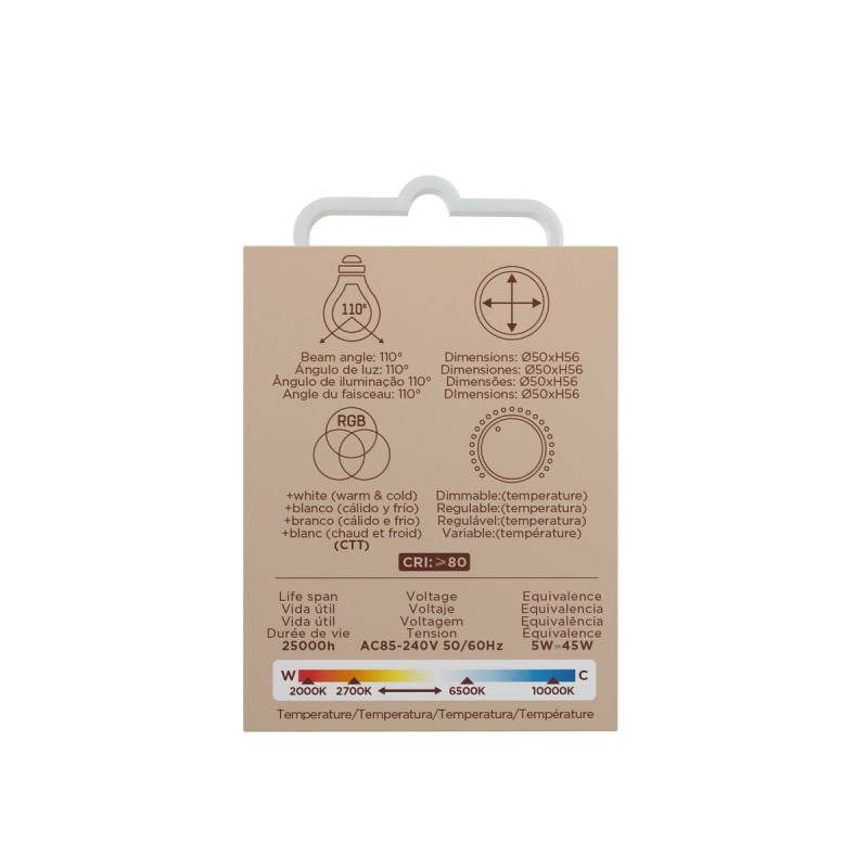 The iO smart bulb by Muvit is an advanced solution designed to provide personalized and efficient lighting in home and professional settings. This device features a GU10 base compatible with most standard fixtures, operating at 5W and producing a luminous flux of 400 lumens, ensuring clear and suitable lighting for small or focused areas. Its RGB technology allows selection among multiple colors, as well as emitting white light in different tones, multiplying options to adapt the atmosphere to any occasion or need. Integrated Wi-Fi connectivity enables remote control of the bulb from iOS and Android devices via specific apps, facilitating management of on/off, color, and brightness adjustments without additional interfaces. Moreover, its compact design with dimensions of 50 mm diameter and 56 mm height ensures easy and discreet installation in any GU10-compatible space. Its A+ energy rating reflects a commitment to efficiency and savings, helping reduce electricity consumption without sacrificing functionality or light quality. This model includes the WEEE fee, complying with current environmental regulations for proper electronic device recycling. Overall, the iO smart bulb by Muvit is a versatile and practical choice for users seeking advanced lighting control via wireless technology, with multicolor capability and easy integration into current smart systems.