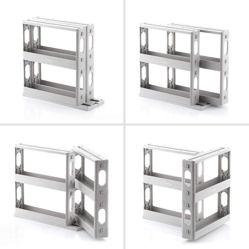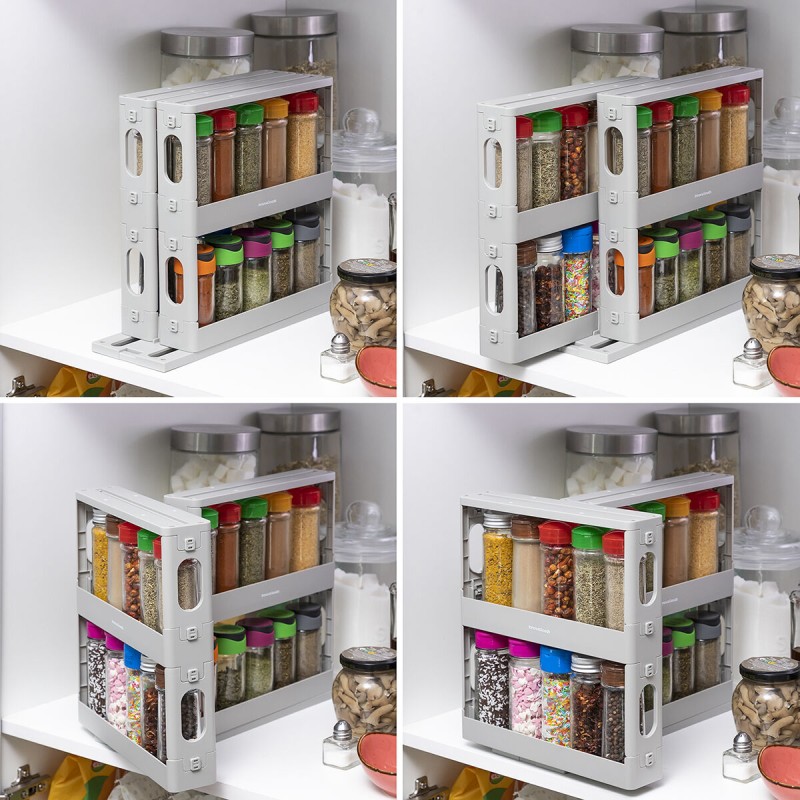 This spice rack features 2 sliding shelves with 2 heights and a 90º angle rotation which makes it easier to access the jars while taking up minimal space. It can also be used in the bathroom or bedroom to organise medication or make-up.