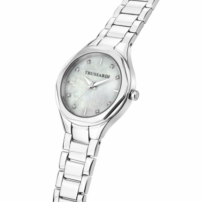 Trussardi SMALL naiste käekell on elegantne ja funktsionaalne aksessuaar, loodud spetsiaalselt naistele, kes hindavad stiili ja praktilisust. Selle hõbedast korpus on vastupidav ja viimistletud peene detailiga, sobides ideaalselt igale riietusstiilile erilise puudutuse lisamiseks. Heleroosa pärlmutterkellaplaat annab kella siidise ja särava välimuse, parandades nii loetavust kui ka visuaalset atraktiivsust. Kellal on mineraalklaas, mis kaitseb tõhusalt igapäevaste kriimustuste eest, tagades selguse ja vastupidavuse pikaks ajaks. Sisemuses töötab kvartsmehhanism, mis on tuntud täpsuse ja madala hooldusvajaduse poolest, pakkudes usaldusväärset ja stabiilset aja mõõtmist. Disain vastab ootustele kui naiste käekell, ühendades funktsionaalsuse ja naiseliku stiili. Trussardi SMALL mudel on ideaalne valik neile, kes hindavad kvaliteetseid materjale ja tehnilist täpsust, rõhutades samal ajal naiselikku identiteeti.