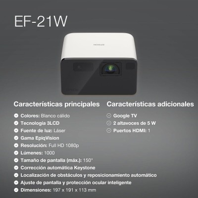 Epsoni EF-21W projektor on kompaktne ja funktsionaalne seade, mis on loodud terava ja tasakaalustatud visuaalse kogemuse pakkumiseks. See projektor omab Full HD (1920x1080 pikslit) resolutsiooni, mis võimaldab kõrglahutusega sisu selgelt ja detailideni esitada. Selle LCD-paneelidel põhinev projekteerimistehnoloogia tagab hea värviedastuse ning LED-valgustus pakub pika kasutusea ja energiatõhusa töö. Heleduselt pakub EF-21W 1000 ANSI luumenit, sobides valgustatud keskkondadesse, tagades eredad ja nähtavad pildid väikestes ja keskmise suurusega ruumides. Natiivne kuvasuhe 16:9 on mõeldud laiekraanvaatamiseks, sobides ideaalselt filmide, esitlustega ja kaasaegse multimeedia jaoks. Kõrge kontrastsus 5 000 000:1 parandab sügavust ja visuaalset detailsust, pakkudes sügavaid musti ja detaile tumedates piirkondades. Valge disain annab elegantse ja tagasihoidliku välimuse, mis sobib erinevatesse keskkondadesse. Ühenduvuse osas sisaldab EF-21W porte nagu USB 2.0 ja HDMI HDCP-toega, mis lihtsustavad ühendamist arvutite, meediapleierite ja teiste digiseadmetega. Kuigi see ei toeta juhtmevabu funktsioone ega puutetundlikkust, on see lihtne ja otsekohene kasutada, sobides hästi professionaalseteks esitlusteks, hariduseks või koduseks meelelahutuseks. Standardobjektiiv tagab korrektse projitseerimise tavapikkustel, ühendades mitmekülgsuse ja lihtsuse. Kokkuvõttes on see Epsoni mudel praktiline lahendus neile, kes vajavad tasakaalustatud omadustega projektorit, hea lahutuse ja heledusega ning kaasaegsete ühendustega igapäevaseks kasutuseks.