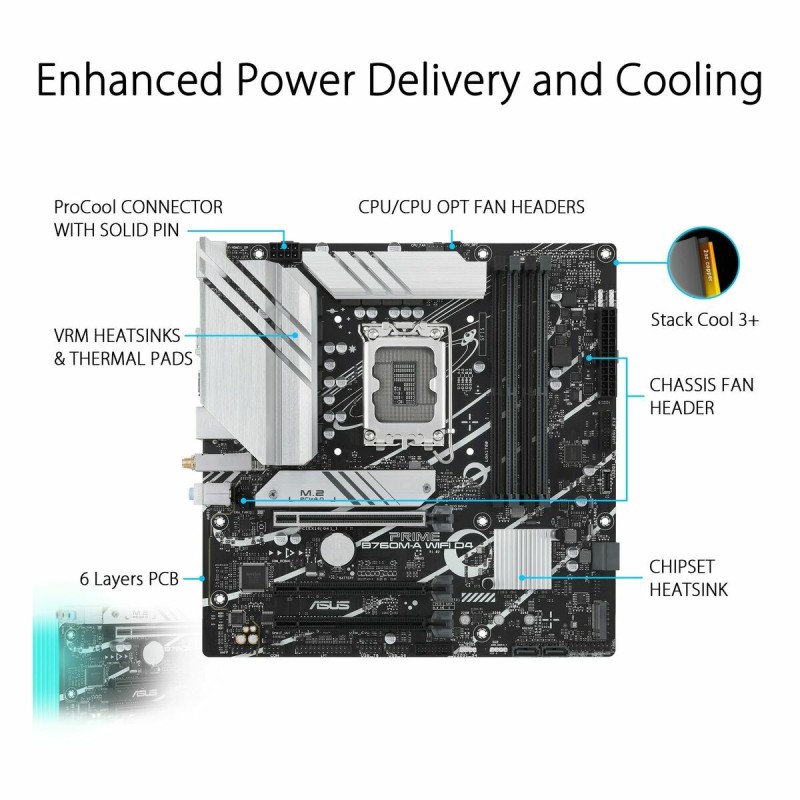 Asus PRIME B760M-A WIFI D4 on emolevy, joka on suunniteltu tarjoamaan optimaalinen tasapaino suorituskyvyn ja liitettävyyden välillä Intel-prosessoreihin perustuvissa järjestelmissä, joissa on LGA 1700-kantaliitin. Tämä emolevy käyttää Intel B760-piirisarjaa, joka tukee Intelin uusimpia arkkitehtuureja ja takaa vakaan ja tehokkaan toiminnan tuottavuus-, multimedia- ja kevyiden pelikäyttöjen tietokoneissa. Sen MicroATX (mATX)-muotoilu mahdollistaa yhteensopivuuden kompaktien koteloiden kanssa ilman laajennusmahdollisuuksien menettämistä, mikä sopii tilaa säästäviin kokoonpanoihin. Se tukee DDR4-SDRAM-muistia, jolloin voi hyödyntää edullisempia RAM-moduuleja, joissa on hyvä tasapaino nopeuden ja virrankulutuksen välillä, ja varmistaa yhteensopivuuden käyttöjärjestelmien, kuten Windows 10, kanssa. Liitettävyyden osalta korostuvat Wi-Fi ja Bluetooth, jotka helpottavat langatonta yhteyttä sekä verkkoihin että oheislaitteisiin, lisäten joustavuutta PC:n rakentamiseen ilman lisälaitteita. Mukana on myös USB 2.0-portteja, joihin voi liittää useita perinteisiä oheislaitteita. Korkealaatuinen muovinen rakenne tekee emolevystä tukevan ja kevyen. Tämä emolevy on monipuolinen vaihtoehto Asus:n keskihintaluokassa, suunnattu käyttäjille, jotka etsivät yhteensopivuutta nykyaikaisten komponenttien kanssa ja integroitua langatonta liitettävyyttä kompakteihin ja toimiviin pöytätietokoneisiin.