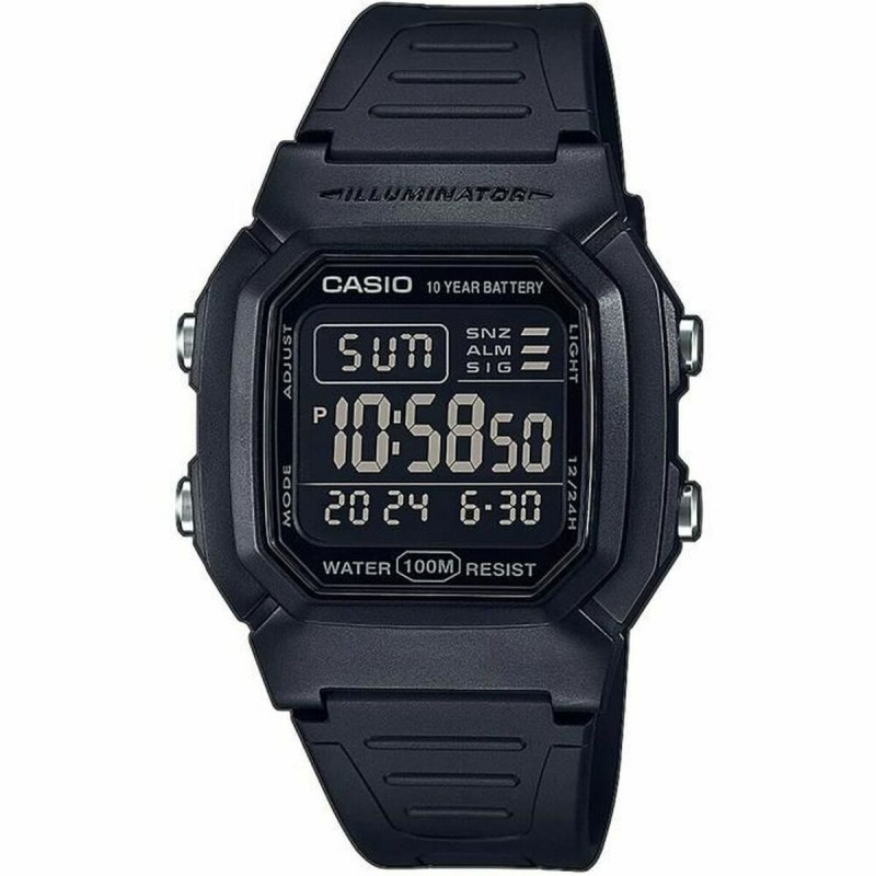 Casio W-800H-1BVES -kello on miesten kello, joka on suunniteltu tarjoamaan toimivuutta ja kestävyyttä käytännöllisessä ja klassisessa muotoilussa. Sen musta hartsikuori ja ranneke takaavat keveyden ja kestävyyden sekä hillityn tyylin arkipäivän käyttöön. Kellossa on LED-taustavalo, joka helpottaa lukemista hämärässä, sekä 1/100 sekunnin tarkkuudella varustettu sekuntikello, joka mittaa jopa 24 tuntia, mikä sopii urheiluun ja ajanottoon. Siinä on useita ohjelmoitavia hälytyksiä ja torkkutoiminto (snooze) sekä tuntimerkki paremman päivittäisen järjestyksen takaamiseksi. Mallissa on automaattinen kalenteri ja mahdollisuus valita 12- tai 24-tunnin näyttö käyttäjän mieltymyksen mukaan. Akryylilasi suojaa kellotaulua, ja 10 barin (100 metrin) vesitiiviys mahdollistaa vesitoiminnat ilman huolta. Pariston kesto on noin 10 vuotta, mikä vähentää huollon tarvetta. Lisäksi kellossa on toinen aikavyöhyke -toiminto, joka on kätevä matkustajille tai eri aikavyöhykkeiden seuraajille. Casio W-800H-1BVES tarjoaa tasapainoisen yhdistelmän kestävyyttä, toimivuutta ja hillittyä muotoilua, tehden siitä käytännöllisen ja pitkäikäisen valinnan monipuolisuutta arvostaville.