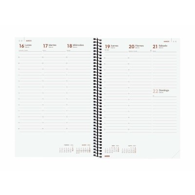 Finocamin YEAR-vuosipäiväkirja on ammatilliseen ja henkilökohtaiseen käyttöön suunniteltu tuote, joka erottuu toimivuudellaan ja korkealaatuisilla materiaaleillaan. Siinä on kierresidonta, joka helpottaa sivujen käsittelyä ja avaamista, kevyet musta läpikuulumaton polypropeenikannet tuovat kestävyyttä, ja kuminauhasuljin suojaa sisältöä. Tämä muistikirja on kooltaan noin 16,5 x 24,2 cm, ammattimainen työpöytämuoto, johon mahtuu taitettuina DIN A5- tai DIN A4 -kokoiset paperit ilman, että ne jäävät ulos, mikä helpottaa lisädokumenttien säilytystä. Sen sivut on painettu 80 g FSC-sertifioidulle kloorittomalle paperille, joka tarjoaa miellyttävän kirjoitustuntuman ja korkean laadun sekä ekologisen sitoutumisen. Jakautuminen on järjestetty pystysuuntaiseksi viikkonäkymäksi, sisältäen täydellisen 12 kuukauden (tammikuu-joulukuu) kalenterin ja mikroperforoidut kulmat, joiden avulla nykyinen päivä tai viikko löytyy nopeasti. Mukana on erityistä informaatiosisältöä, kuten nimipäivät, kansalliset pyhäpäivät, vuodenaikojen vaihtelut sekä uusien vuosien alut kiinalaisen, muslimi-, ortodoksi- ja hepreankalenterin mukaan. Lisäksi tarjolla on arvokasta lisätietoa suunnitteluun: henkilökohtaiset tiedot, aikataulut, kuluvan ja seuraavan vuoden vuosisuunnitelmat, kansainväliset pyhäpäivät sekä hyödyllisiä vinkkejä, kuten Googlen haku ja Finocam-näppäimen käyttö. Kaikki tämä on esitetty espanjaksi, tarkoituksena helpottaa tarkkaa ajanhallintaa ja tehokasta ajankäyttöä. Sen moderni ja toimiva muotoilu tekee siitä monipuolisen työkalun ammattilaisille, opiskelijoille tai käyttäjille, jotka tarvitsevat yksityiskohtaista ja selkeää hallintaa päivittäisistä tehtävistään koko vuoden ajan. Yhteenvetona Finocamin YEAR-vuosipäiväkirja yhdistää laadukkaat materiaalit, ajantasaisen hyödyllisen tiedon ja muodon, joka pitää arjen järjestyksessä niin henkilökohtaisessa kuin työelämässä.