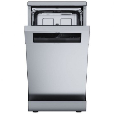 Teka DFS 24650. Laitteen sijoitus: Vapaasti seisova, Tuotteen koko: Slimline (45 cm), Oven väri: Ruostumaton teräs. Paikkoja: 9 paikkoja, Melupäästöluokka: C, Melutaso: 47 dB. Energialuokka: E, Vedenkulutus per sykli: 9 L, Energiankulutus 100 sykliä kohti: 70 kWh. Tuotteen leveys: 448 mm, Tuotteen syvyys: 600 mm, Tuotteen korkeus: 845 mm