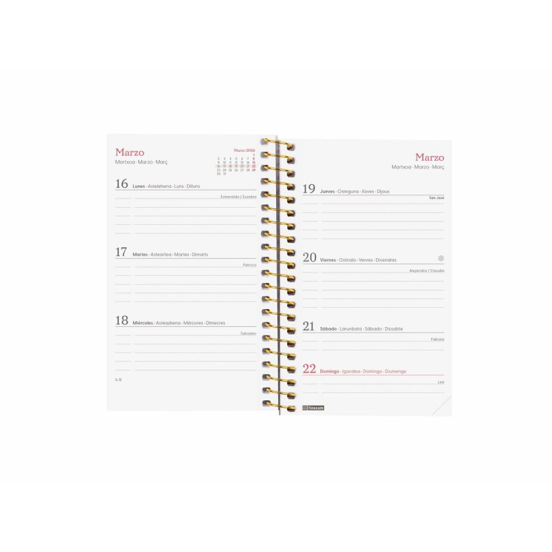 Finocam prekės ženklo DESIGN COLLECTION Goldy mini dienoraštis skirtas efektyviam ir patogiam laiko valdymui tiek asmeniniame, tiek profesiniame gyvenime. Jis išsiskiria kompaktišku 7,9 x 12,7 cm mini formatu, kuris palengvina kasdienį nešiojimą ir naudojimą, o lengvos polipropileno dangteliai užtikrina patvarumą ir atsparumą kasdieniam naudojimui. Spiralinis rišimas leidžia patogiai atverti dienoraštį, o elastinė guma užtikrina, kad jis liktų uždarytas ir apsaugotų vidines puslapius. Spalvotas, modernus dizainas derina funkcionalumą ir stilių, tinka ieškantiems praktiško ir šiuolaikiško įrankio. Viduje aiškiai ir tvarkingai išdėstyta horizontalios savaitės peržiūros sistema, paliekanti pakankamai vietos užrašams apie projektus, užduotis ir kasdienius įsipareigojimus. Taip pat yra metinis kalendorius su 12 mėnesių (sausis-gruodis) ir papildoma informacija, tokia kaip vardadieniai, valstybės šventės bei svarbūs duomenys apie sezoninius pokyčius ir kinų, musulmonų, ortodoksų bei žydų kalendorių šventes. Dienoraštis turi mikroperforuotas kampelius, leidžiančius greitai rasti einamąją dieną ar savaitę ir pagreitinti informacijos paiešką. Pagamintas iš 80 g/m² FSC sertifikuoto, chloro neturinčio popieriaus, užtikrinančio ekologinį standartą ir sklandų rašymą. Šis produktas – lengvas ir funkcionalus sprendimas, idealus tiems, kurie vertina asmeninę organizaciją kompaktišku ir patogiu formatu. Jis atitinka klasikinius planavimo poreikius ir išsiskiria kruopščiu dizainu savo kategorijoje.
