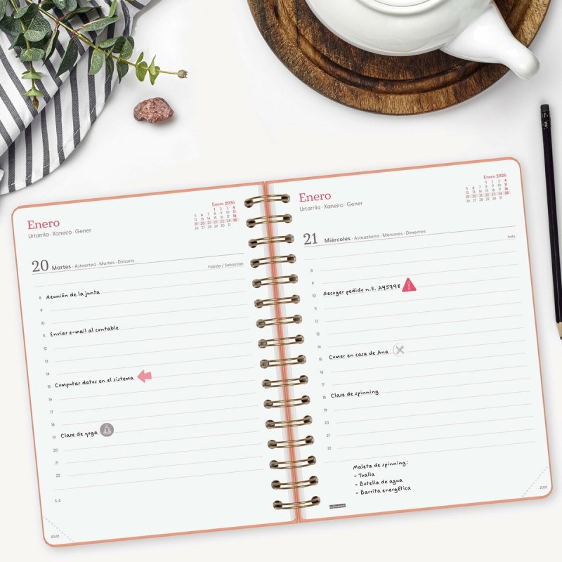 Finocam prekės ženklo Alma darbotvarkė yra aukštos kokybės 2026 metų darbotvarkė, derinanti funkcionalumą ir kruopštų dizainą, tinkama tiek asmeniniam, tiek profesiniam naudojimui. Ji turi kietą kartoninį viršelį, padengtą matinėmis, atspariosiomis įbrėžimams plėvelėmis, užtikrinančiomis patvarumą ir ilgaamžiškumą, taip pat elegantišką išvaizdą su metalizuotais spaudiniais, kurie pabrėžia estetiką. Formatas panašus į A5 (15,5 x 21,2 cm) – praktiškas ir nešiojamas dydis, palengvinantis naudojimą ir laikymą. Spausdinta ant 80 g/m² popieriaus, suteikiančio tinkamą kokybę rašymui įvairiais rašymo įrankiais, o dviguba spiralė leidžia atverti darbotvarkę visiškai ir patogiai rašyti. Yra elastinė guma užsegimui, kuri saugo darbotvarkę ir padeda išlaikyti turinį apsaugotą. Kampai mikroperforuoti, kad būtų lengva ir greita rasti einamąją dieną ar savaitę, taip pagerinant vizualinę organizaciją. Vidus suplanuotas aiškiai ir funkcionaliai, su pakankamai vietos projektų, užduočių ir kasdienių įsipareigojimų planavimui pagal 12 mėnesių metinį kalendorių (sausis–gruodis), įskaitant vardadienius, valstybines šventes, metų laikų kaitą ir kitą naudingą informaciją planavimui. Taip pat pridedamas teminių lipdukų rinkinys svarbiems įvykiams pažymėti. Visa informacija pateikta ispanų kalba, palengvinant naudojimą ispanakalbėse rinkose. Koralo spalvos viršelis suteikia išskirtinumo, išlaikant santūrumą. Pagaminta Kinijoje pagal standartus, patvirtinančius, kad popierius yra FSC be chloro, atspindintis rūpestį aplinkos tvarumu. Iš viso, Finocam Alma darbotvarkė yra praktiškas, patvarus ir skirtas kasdienės organizacijos optimizavimui, derinantis nešiojamumą, patogumą ir estetinį dizainą.