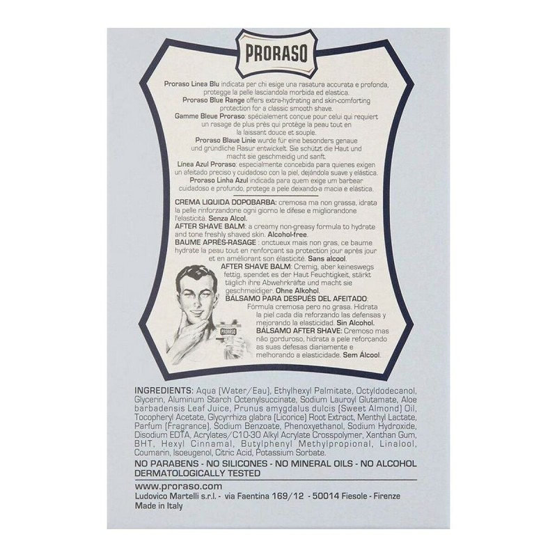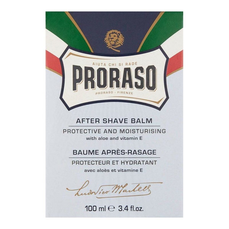 Balzamas po skutimosi Proraso Blue E 100 ml Balzamas po skutimosi Proraso Blue E 100 ml yra kokybiškas produktas, skirtas išrankiems žmonėms, kurie rūpinasi savo išvaizda ir ieško geriausios kosmetikos savo grožiui paryškinti. Jei esate vienas iš jų, šie 100% originalūs Proraso produktai yra sukurti jums.