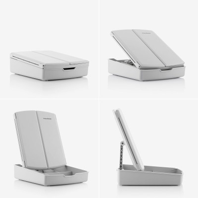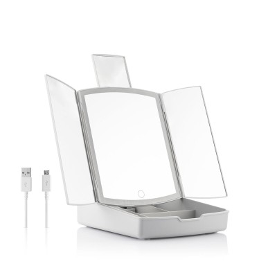 Oriģināls salokāms LED spogulis ar grima organizētāju (3 in 1 vairākas funkcijas), kas ir ideāli piemērots ērtai grima uzklāšanai ar optimālu redzamību. Pateicoties tā modernajam dizainam, salokāmajam un vairākiem grima instrumentu un produktu uzglabāšanas nodalījumiem, tas ļauj ietaupīt vietu un vienmēr turēt pie rokas visu nepieciešamo, lai viegli uzklātu grimu. Turklāt tas ir ļoti daudzpusīgs un pielāgojams, jo tas darbojas, izmantojot USB (iekļauts USB uz mikro USB kabelis) vai ar baterijām (nav iekļautas), atkarībā no vēlmēm. Tam ir LED gaisma ar skārienvadību un 3 apgaismojuma režīmi (aukstā gaisma, siltā gaisma, dienas gaisma). Šim panorāmas un pārnēsājamam galda spogulim ir centrālais spogulis un divi sānu spoguļi, kas viegli salokās un atlokās. Tajā ir iekļauts arī mini bīdāms spogulis aizmugurē ar x7 palielinājumu, lai labāk redzētu vēlamo sejas zonu. Tam ir mazas neslīdošās pēdas, kas nodrošina stingru noturību.