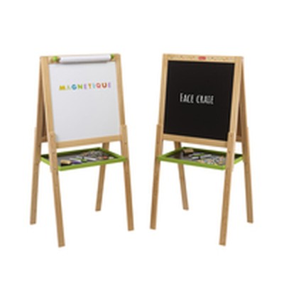 Jeujura zīmola divpusējā tāfele ir daudzfunkcionāla zīmēšanas dēlis, kas paredzēts, lai veicinātu radošumu un mācīšanos bērniem no 3 gadu vecuma. Tā ir izgatavota no dabīga koka, nodrošinot izturīgu un ilgmūžīgu konstrukciju, ideāli piemērotu biežai un drošai lietošanai izglītojošās spēlēs. Šai tāfelei ir divas atšķirīgas virsmas: klasiskā balta krīta puse, kas piemērota tradicionālai krīta zīmēšanai, un magnētiskā balta puse, kur var izmantot tāfeles marķierus vai piestiprināt magnētus, paplašinot spēļu un mācību iespējas. Aptuvenie izmēri ir 56 cm, nodrošinot pietiekami lielu formātu, lai bērni ērti izteiktu savas idejas un trenētu rakstīšanu un zīmēšanu. Dizains apvieno daudzkrāsainas krāsas, kas pievilina uzmanību un stimulē interesi, kā arī viegli iederas dažādās bērnu vidēs. Šis oriģinālais un neizpakotais produkts ir daudzpusīgs rīks, kas veicina smalko motoriku, radošumu un interaktīvu mācīšanos, pielāgojoties dažādiem vecumiem un prasmju līmeņiem. Jeujura tāfele piedāvā praktisku un drošu risinājumu mājas vai izglītības lietošanai, pateicoties divpusējai sistēmai, kas ļauj viegli mainīt mācību un spēļu metodes, padarot mācīšanās procesu dinamiskāku un interesantāku. Kopumā tā ir funkcionāla un ekonomiska izvēle tiem, kas meklē pievilcīgu un izturīgu didaktisku atbalstu mazajiem bērniem.