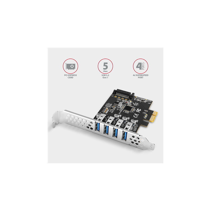 - Producer product family: PCI-Express card with four external USB 3.2 Gen1 ports with dual power