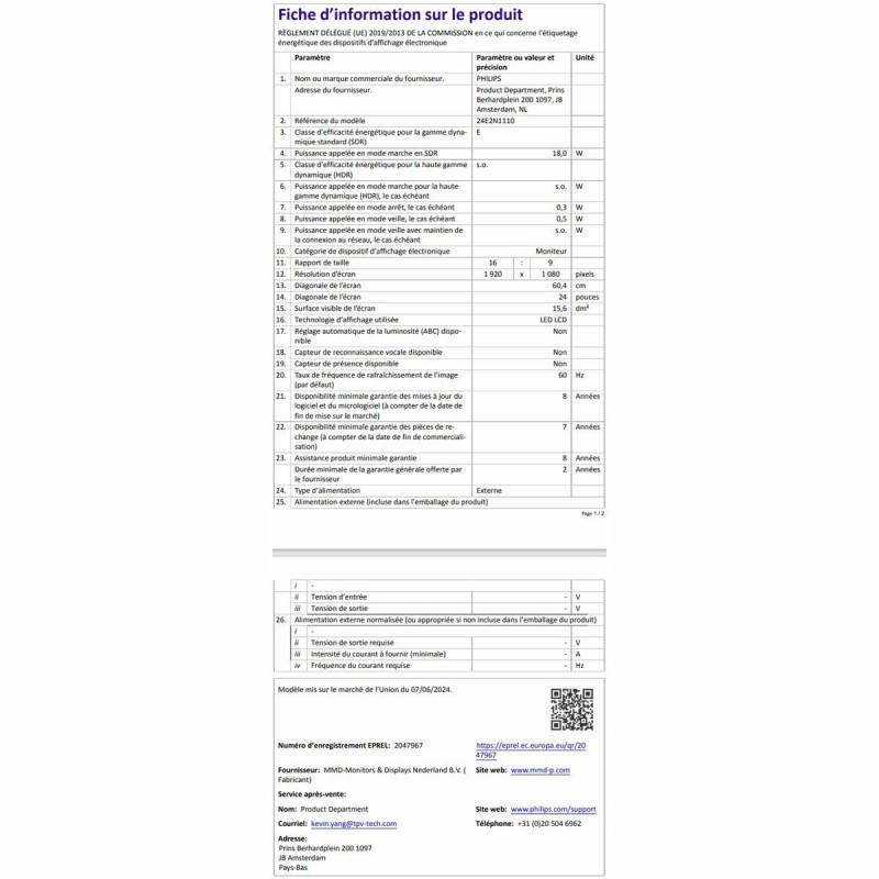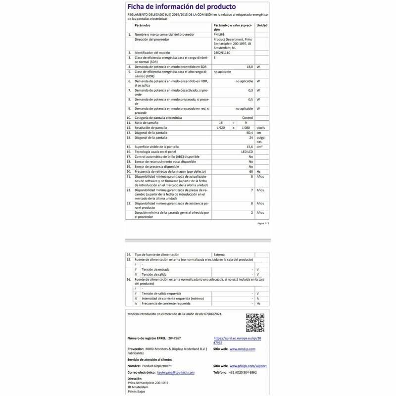 Philips 24E2N1110/00 monitors ir ierīce, kas izstrādāta, lai nodrošinātu optimālu vizuālo pieredzi profesionālās un mājas vidēs, izceļoties ar 23,8 collu ekrānu ar IPS tehnoloģiju, kas garantē plašus 178° skata leņķus gan horizontāli, gan vertikāli, nodrošinot vienmērīgu un konsekventu krāsu atveidi no jebkuras pozīcijas. Tā LCD panelis ar baltu LED aizmugurgaismojumu sniedz līdz 300 cd/m² spilgtumu un tipisku kontrastu 1500:1, kā arī ātru reakcijas laiku aptuveni 4 ms (pelēkais-pelēkais), piemērots gan multimediju darbam, gan ikdienas uzdevumiem ar ātru attēlu atjaunināšanu. Šis modelis ietver tehnoloģijas, piemēram, SmartContrast Mega Infinity DCR labākai toni atšķiršanai un SmartImage, kas dinamiskā veidā optimizē kontrastu un asumu atbilstoši attēlam. Tas ir flicker-free sertificēts un aprīkots ar LowBlue režīmu acu noguruma samazināšanai ilgstošās sesijās, papildināts ar matētu pretreflektīvu pārklājumu, kas samazina atspīdumu un nodrošina ērtu skatīšanos mainīgos apgaismojuma apstākļos. Pilnas HD izšķirtspēja 1920 x 1080 pikseļi pie 120 Hz HDMI nodrošina asus un plūstošus attēlus, bet pikseļu blīvums 92,56 PPP ļauj skaidri un detalizēti redzēt saturu. Monitors nodrošina daudzveidīgu savienojamību ar HDMI 1.4 un VGA ieejām, garantējot saderību ar plašu ierīču klāstu un vieglu integrāciju esošās darba vietās. Tā elegants matēti melns dizains ar regulējamu slīpumu (-5° līdz 20°) un VESA stiprinājuma atbalstu 100x100 mm veicina ergonomiku un pielāgojamību dažādām darba vietām. Energoefektivitātes ziņā ierīce patērē vidēji 5,6 W darbības režīmā un nodrošina zemas patēriņa režīmus, atbilstoši starptautiskajiem standartiem, piemēram, RoHS, CE, FCC un citām sertifikācijām, kas apliecina ilgtspējību un drošību. Komplektā ir nepieciešamie piederumi, tostarp HDMI un barošanas kabeļi ātrai un vienkāršai uzstādīšanai. Kopumā Philips 24E2N1110/00 monitors apvieno modernu ekrāna tehnoloģiju un komfortu ar elastīgu savienojamību un funkcionālu dizainu, piedāvājot uzticamu un daudzpusīgu risinājumu lietotājiem, kuri vēlas kvalitatīvu un sabalansētu vizuālo pieredzi.