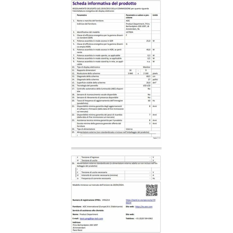 AOC U27B3A spēļu monitors ir 27 collu ekrāns, kas radīts, lai nodrošinātu uzlabotu vizuālo pieredzi, piemērots gan produktivitātes lietotājiem, gan augstas kvalitātes multimediju cienītājiem. Šis modelis izceļas ar 4K Ultra HD (3840 x 2160 pikseļi) izšķirtspēju, kas garantē ļoti asus attēlus un precīzas detaļas, ideāli piemērots dizaina, rediģēšanas vai prasīgas izklaides darbiem. Ekrāns izmanto LED tehnoloģiju kopā ar IPS paneli, nodrošinot precīzas krāsas un plašus skata leņķus līdz 178° gan horizontāli, gan vertikāli, kas ļauj skaidri redzēt no gandrīz jebkuras pozīcijas. Turklāt tas atbalsta HDR10, kas uzlabo kontrastu un krāsu atveidi, parādot reālistiskākus un dziļākus attēlus, īpaši saderīgos materiālos. Elegants dizains ar trīs pusēm ļoti šauru rāmi atvieglo vairāku ekrānu konfigurācijas, bet matētais melnais apdare novērš nevēlamus atspīdumus un piešķir profesionālu izskatu. Flicker Free tehnoloģija un zila gaisma samazinoša funkcija palīdz samazināt acu nogurumu ilgstošas lietošanas laikā, padarot monitoru piemērotu garām darba vai izklaides stundām bez diskomforta. Tas piedāvā 4 ms reakcijas laiku, kas ir pietiekams ikdienas spēlēm un plūdenai attēla atveidei, kā arī atbalsta Adaptive Sync, kas novērš attēla plīsumu, nodrošinot vienmērīgāku spēļu pieredzi. Iebūvētie 2 vatu skaļruņi nodrošina pamata skaņu bez papildu ierīcēm, un VESA stiprinājums ļauj elastīgi uzstādīt monitoru uz atbilstošiem balstiem vai rokām. Konstrukcija atļauj regulējamu slīpumu un daļēji izjaucamu dizainu, kas atvieglo ergonomisku pozicionēšanu darba vai spēļu vidē. Kopumā AOC U27B3A apvieno modernu tehnoloģiju un ergonomiku lietotājiem, kuriem nepieciešams daudzpusīgs 27 collu UHD ekrāns ar augstu izšķirtspēju un precīzām krāsām, piemērots produktivitātei, izklaidei un mērenām spēlēm.