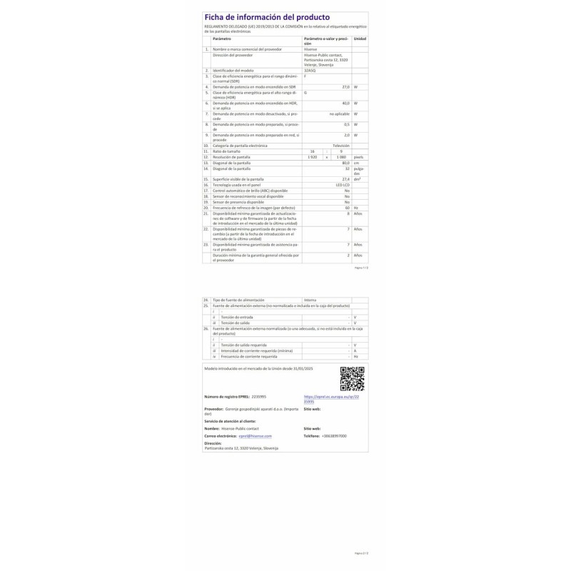 Hisense 32A5Q ir 32 collu Smart TV, kas apvieno efektīvu attēlojumu ar gudrām funkcijām, piemērots vidēja lieluma telpām vai otrās istabas izmantošanai. Tā 32" plakanā ekrāna izšķirtspēja ir Full HD 1920 x 1080 pikseļi, nodrošinot asu un detalizētu attēlu, kas ir ideāli piemērots augstas izšķirtspējas saturam ar labāku kvalitāti nekā standarta HD modeļi. Šim televizoram ir VIDAA operētājsistēma, kas ir pazīstama ar vienkāršu un ātru piekļuvi lietotnēm un straumēšanas pakalpojumiem, nodrošinot intuitīvu un ērtu lietotāja pieredzi. Tāpat tas atbalsta WiFi savienojumu, ļaujot bezvadu interneta pieslēgumu, lai skatītos tiešsaistes saturu bez vadiem. Skaņas jomā tas piedāvā aptuvenu 16W RMS jaudu, nodrošinot skaidru un pietiekamu skaņu mazām un vidēja lieluma telpām. Attiecībā uz uztveršanu, Hisense 32A5Q ir aprīkots ar pilnu DVB-C, DVB-S, DVB-S2, DVB-T un DVB-T2 uztvērēju, kas ļauj saņemt digitālos kanālus gan caur antenu, kabeli, gan satelītu, palielinot tā pielāgojamību dažādām signāla infrastruktūrām. Tā melnā krāsa piešķir elegantu un neuzkrītošu dizainu, kas viegli iederas jebkurā interjerā. Tomēr enerģijas efektivitātes ziņā tas ir novērtēts ar F un G klasi, kas var ietekmēt elektroenerģijas patēriņu salīdzinājumā ar efektīvākiem modeļiem, ko vajadzētu ņemt vērā enerģijas taupīšanas interesentiem. Kopumā šis Hisense Smart TV apvieno labu attēla kvalitāti, savienojamības iespējas un viegli lietojamu operētājsistēmu, veidojot līdzsvarotu izvēli tiem, kas meklē funkcionālu un kompakta izmēra viedo televizoru.