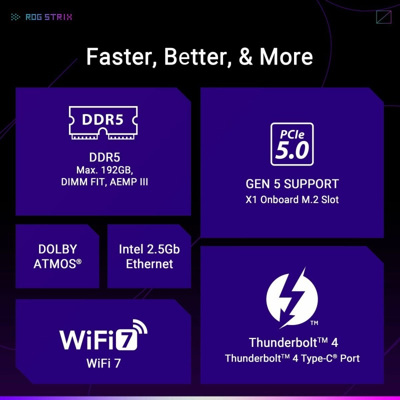 Материнская плата ASUS ROG STRIX B860-F GAMING WIFI — это материнская плата, предназначенная для пользователей, которым важны надежность и производительность в системах на базе ПК с нативной поддержкой Windows 11. Эта плата выделяется современным чипсетом Intel B860, разработанным для максимального использования процессоров с сокетом LGA 1851 (Socket V1), позволяющим устанавливать новейшие CPU с улучшенной энергоэффективностью и производительностью. Формат ATX обеспечивает оптимальный баланс между пространством для компонентов и вентиляцией, упрощая установку в стандартные корпуса и интеграцию с другими устройствами. В части подключения предусмотрены порты HDMI для качественного видеовыхода на мониторы и внешние устройства, а также поддержка USB, USB-C и технологии Bluetooth, расширяющая возможности подключения периферии, беспроводных устройств и внешних накопителей. Функции серии ROG STRIX гарантируют продуманный дизайн, ориентированный на геймеров и пользователей, нуждающихся в стабильности при длительной или интенсивной работе. Эта плата сочетает современную совместимость с актуальными ОС и новейшим оборудованием, являясь надежной основой для сборки или обновления высокопроизводительных и универсальных систем. В итоге ASUS ROG STRIX B860-F GAMING WIFI — сбалансированное решение для сборки настольных ПК с современными техническими требованиями, предлагающее передовые технологии и полный набор интерфейсов.