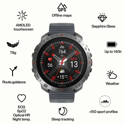 Пол: Мужской Тип: Наручные часы Дополнительные звенья: Нет Тип часов: Наручные часы Цвет: Серый Материал: Характеристики:Акселерометр Барометр Тактильный экран Датчик внешней освещенности Высотомер Функция будильника Хронометр Голосовая активация Соединения: Тип аккумулятора: Интегрировано Подключаемость:Bluetooth GPS Glonass BeiDou Galileo Bluetooth 5.1 Внутренняя память: 32 GB Цвет ремешка: Серый Форма: Круглый Экран: 1,39" Функции: Монитор сна Технологии: AMOLED Разрешение: 454 x 454 px Работает на батарейках: 1 Polímero de litio Водонепроницаем: 10 atm Код S0462621